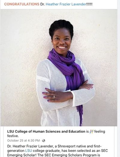 Baton Rouge, LA - PhD Science Education student, Heather Lavender, was recently selected as an SEC Emerging Scholar. When asked what she enjoyed most about the workshop, Lavender replied, “I felt that they [faculty] were honest and presented their authentic selves in answering the questions we asked.” Lavender also discussed with faculty the value of being selected as an SEC Scholar and her goals for the future in the SEC. Lavender says that in the future she hopes to be writing to the SEC Emerging Scholars Program with news of being an Assistant Professor, an Associate Professor, a Professor, and even perhaps a Chairman of her department.